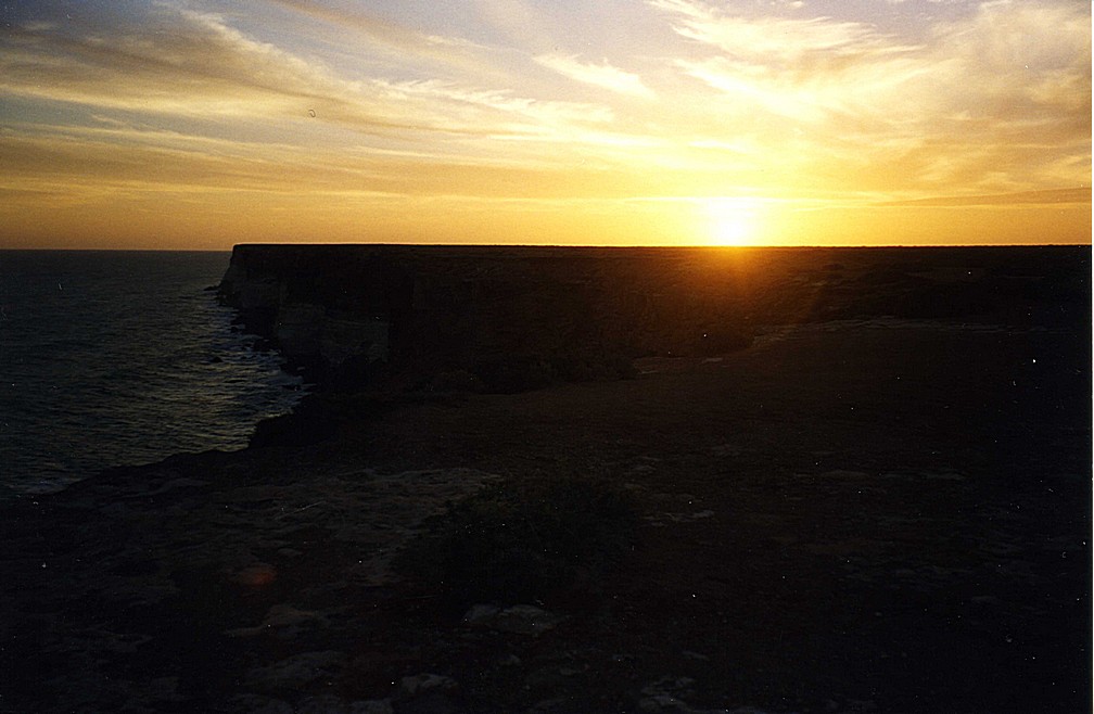 We could see the waves crashing at the base of these cliffs which were white limestone at the bottom and a different reddish coloured soil above that. I could imagine the terror that the men in the pioneering story that I read about them, crossing the Nullarbor exploring it all those years ago, finally getting to the end and just seeing the waves crashing at the bottom of these cliffs – it would have been quite terrifying. While we were there we met a couple of chaps on a motorbike, father and son it turned out, and they had been 8000 kilometres in 10 days to New South Wales – they were on their way back to Perth. Quite a way to go! We stopped at the next lookout on the Nullabor, which was the middle of the five and we decided to stay there for the night, it was now 5.10. This lookout wasn't as good as the last one in the views up and down the cliffs weren't as obvious and you had to walk a short distance to get to them. This did mean that we were a little distance back from the edge of the cliff and as we were staying for the night there, was good as far as I was concerned. All there was there was a few plants at ground level, browny coloured soil, deep blue sea and the blue sky the whole way around. Adrian had a shower and later we took photos of a beautiful sunset.