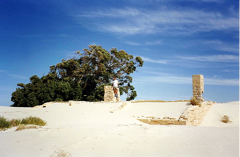 We also looked at a Travellers Cross, built when the road was tarmacked in 1969. We then drove down the four kilometres on a sandy track to the Old Telegraph Station, and on the way there, three emus ran across the road in front of us. We viewed the Old Telegraph Station on the sand dunes but it was buried right up to the chimney's now, but quite a spectacular sight. However, a great downer was the large biting flies that kept landing on us all the while we were there, March flies apparently, and this is April, what were they doing there?