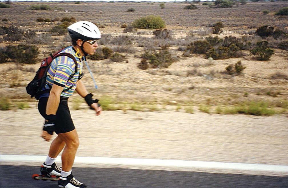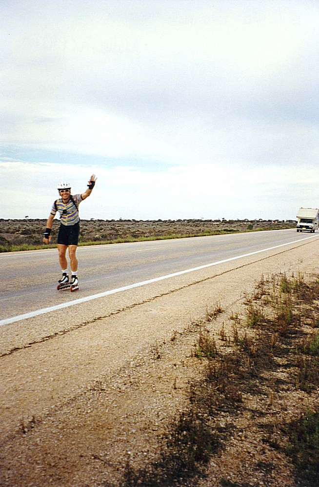 On the way back we filmed another sleepy lizard, like we'd seen in the Flinders, but this was our own. This was another name for it, as it was a shingle back or a stumpy tail and it was a type of skink. This was on the road just after telegraph station We saw two more stumpy tails just after this and then rejoined the main road westward. I should mention that when crossing the Nullarbor, all vehicles wave to each other. There are perhaps more vehicles than we might have imagined and more cars and caravans but then we are in week following Easter. There are still few enough vehicles for everyone to recognise everyone else. We stopped at Mundrabilla for diesel which was much cheaper than the last place and then about 10 kilometres further on for lunch. We did take a bit of video here and afterwards Adrian had a rest. Time passed very quickly, we were listening to a story on cassette that Val had given me of Cari Loder, who was multiple sclerosis sufferer, and who inadvertently came across a remedy for multiple sclerosis. It was very listenable to and entertaining and certainly filled in the day [sadly, it was later shown to have little effect on most people and she, when it finally had no effect on her either, and she could no longer cope with the pain, she committed suicide in 2009]. Not long after finishing listening to that, we passed a person who was roller blading across the Nullarbor and we stopped to photograph and film him.