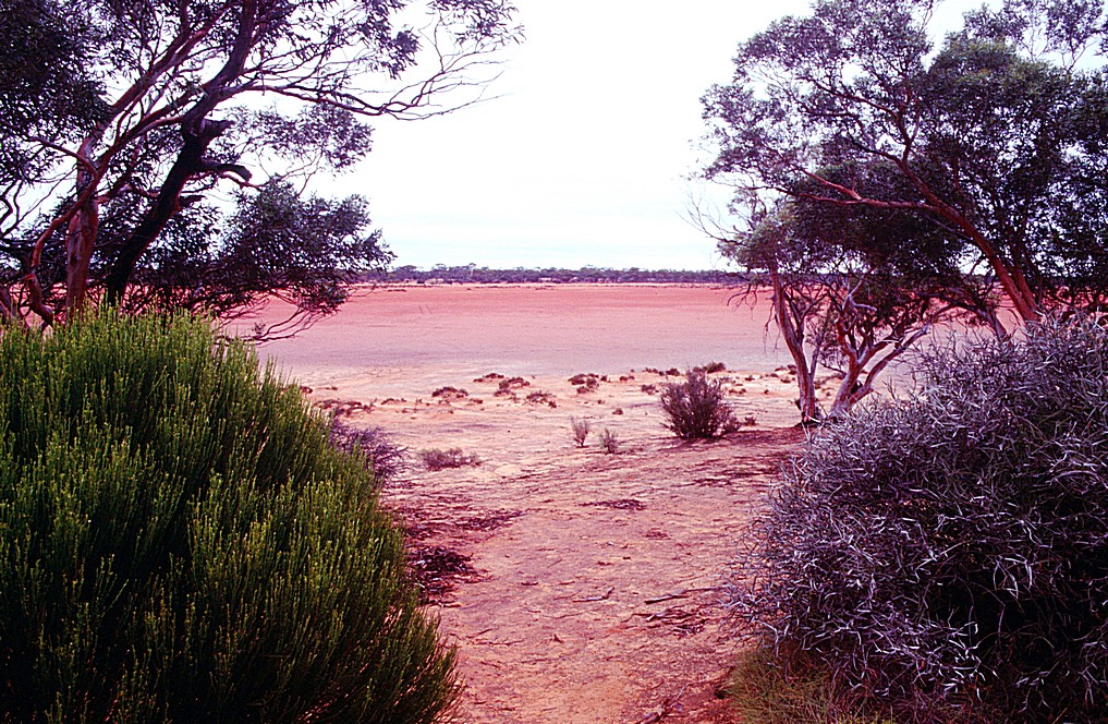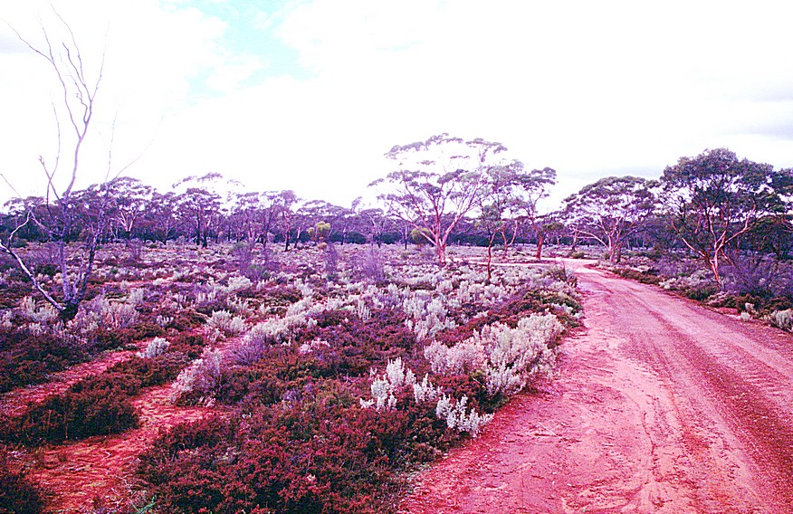 One or two things had been restored, but you certainly wouldn't see anything like that in England. We left and turned to south towards Norseman and started on a fruitless search for somewhere to stop for the night. As we did so there were some strange isolated, billowing clouds in the sky, and the sun being very low, lit them up, one particular pink and then a strange blue glow, rather eerie and threatening. The trouble with this road was that on one side there was a pipe laid, just a few feet from the road and parallel with it and initially on the other side there was a fence, which was very unusual, and when we did come to a parking area it didn't go back any depth because of this fence. We couldn't risk going far off the road anyway because with recent heavy rainfall and everywhere was a red quagmire of muck and we would get stuck in it. Eventually we found a parking space, a few miles north of the junction of the road to Kalgoorlie. It was just about 6 o'clock and just getting dark and we were slightly reticent in case it rained heavily again and we parked only a short way back from the road and were set to for the evening. It was a clear night with lots of stars.