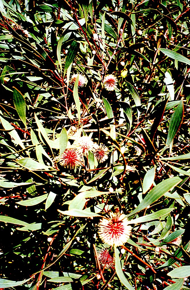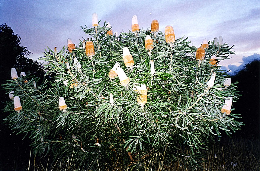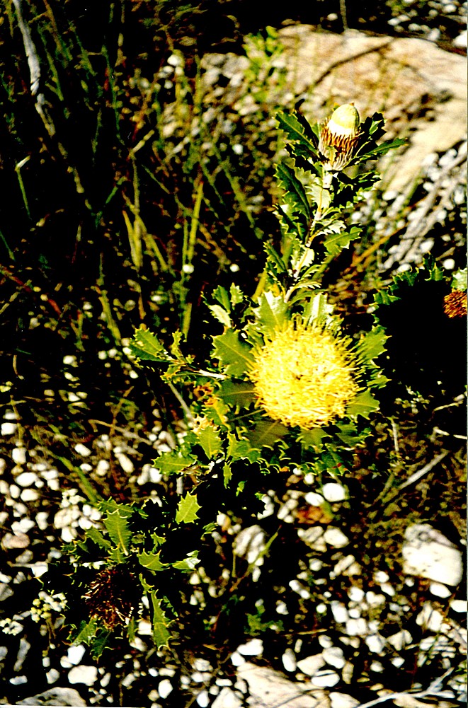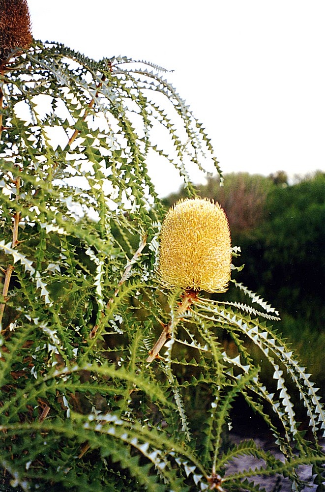 We stopped at the picnic site and had our coffee, sitting on a log, the sun was very hot. There were clouds and it was cooler when the sun went in, naturally. After our coffee, we went for a walk around this area of rocks, which seemed to be strewn over a vast area and some of the rocks are very large. Unfortunately, some had graffiti on, but more of a problem, as far as I was concerned, was the glass scattered around on the ground and we were rather annoyed by pretty large flies, which improved with a spraying of insecticide. The ground was alive with all the little shoots coming through after the recent amount of rain and it's quite exciting to see grass coming through and some areas absolutely covered with little seeds which had just germinated and we're showing patches of green here and there. We also viewed the wall of the reservoir which must have served the town when it was here, and this was in the process of being rebuilt. We stopped briefly at the Bromus Dam a small reservoir which was built apparently in the past, so that the steam engines could fill up with water - it didn't excite me madly. We stopped for lunch in a layby which was marred only by flies again. We passed the tiny township with the interesting name of Salmon Gums, named after the Mallee eucalyptus trees mentioned earlier with their redddy coloured bark. There was a huge grain store being built there. A few miles on we came into the so called township of Grass Patch, a wonderful name and very appropriate as just prior to this the verge beside the road had sprung up a vivid green, which seemed unreal, but alas the township of Grass Patch was no more. There was a tin post office and stores 'buttoned up' and a deserted house and there were some new grain stores, which seemed to be the only thing that was happening here and a so called Memorial Park which just seemed to be a Memorial, nothing else of Grass Patch despite its interesting name. It now looked rather English looking out onto fields which were beginning to green, and for the first time for a long time we saw sheep in the fields and odd little lambs although it's autumn here. We approached Esperance and realised that we needed somewhere to stay for tonight, and that it might be difficult, and in fact turned back off on the road out of Esperance, by a lake where we had seen in our book of free campsites that there was a place where we could camp. Unfortunately, when we got there it said 'no camping', they had just newly gravelled a little area. It was now 4 o'clock, and we went down the road to a lake, called Monjingup Lake, which was a reserve. We then spent an hour and a half walking around this reserve, which was full of delight. Lots and lots of birds, honey eaters and all sorts an lots of banksias of different varieties.
