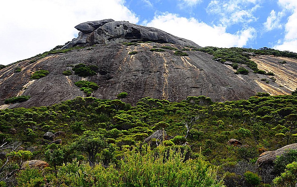 We carried on into Sterling Ranges National Park. We noticed one or two flowers beside the road, rather heather looking flowers, so different from anything we've seen before. Other than that, there were these peaks that make up the Sterling Ranges in a sort of vaguely east west direction, but they were all clothed in uniform looking green. The significant thing here is the black boys, black stemmed plants with what looks like grass growing out of the top and which are dotted everywhere. Other than that, all the peaks look just the same covered in this vegetation. We pulled in to what said it was a scenic lookout, 400 metres, but what it didn't say was it was 400 metres vertically, more or less with a very rough path. The rock was strange, particularly towards the top where it was sort of jutting out at angle, which made it difficult to walk up - the wrong sort of angle. It was difficult to describe. Not much had been done to the path, it was just a way up there and from the top we could view the plains going down towards the sea and these mountains which stick right out from them and peaks all around us. We returned from there and had our lunch in the van in the same car park on account of it being extremely windy and seem to get windier while we were sitting there.