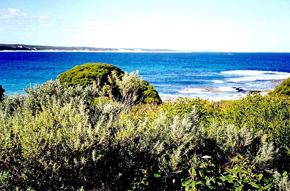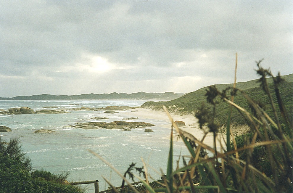 We then walked in the opposite direction along the beach and back and paddled a bit, we found the sea surprisingly warm. Our little spot was still in the shade, so we then got breakfast together and sat on plastic bags as seats on the beach to have our breakfast and left at 8.45. We travelled a short way south into West Cape Howe National Park, and made for Shelly Beach which was very picturesque, but a long trail down there. When we got there we got in conversation with a chap in his 70s, he was caravanning there. Two very interesting points the first, he started talking about Devon, where his father had been born, and he said there was some sort of tragedy there, and he was talking about the book by Ken Small about Slapton Sands, which we had with us because Ali had brought it back to Australia. In chatting more, it turned out that his wife's son, was one of the two tourists on the London Bridge Rock when it collapsed on the Great Ocean Road and he showed us some photographs of this. That was such an amazing coincidence to me, somebody who knew all about that. When we finished our long conversation, we decided to go for a walk along the beach there. It had rained a bit in the night and as we set off across the beach, it started to rain again and my trousers got a bit wet from waves coming in, but we got very wet on our tops from the water coming down. As we were returning from the beach, the Chap was coming to meet us with some waterproofs. We returned to the van and changed into some dry things and decided to have our tea and coffee there, although it was still quite early and Adrian filled a bottle with some water which we're told was the best water in Australia. Adrian said the water in fact was just stream water but very clear. The rain continued as we drove towards Denmark and visibility wasn't good. When we got to Denmark, it was very grey, but it wasn't raining. We had decided to do a little walk here, which was either side of the river, so we drove down to a bridge near the mouth and had a very pleasant walk beside the river. In crossing it at Denmark, we went into a bakers and brought some rolls and cakes and walked back on the other side. It was sort of damping and pretty green. We saw a lot of birdlife, spoonbills, cormorants, egrets, a heron and various ducks and gulls and we'd heard moaning frogs. When we got back we had lunch sitting at the table outside the van overlooking the water, but unfortunately it came on with a little bit of rain just before I'd finished my cake. We next drove down the Ocean Road to Wilson Head where the rough sea was coming in and after snooze, we had a little walk here . The rough sea was on one side and we walked a little way to see the calm inlet on the other side, it was pretty cold at this point, but people were in surfing. We then drove back up to the main South Coast Road turning off again to William Bay National Park where we stopped at what was called the Green lagoon and walked down to a very nice attractive beach, it would have been lovely in hot weather. There were a lot of rocks out to sea making a lagoon with rough waves out to sea and then this calm bit, where one could swim if it was warmer.