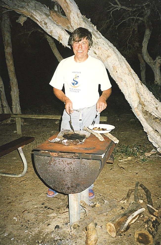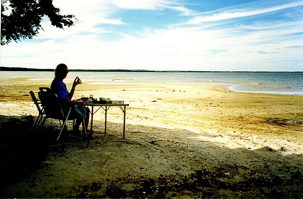 A couple of other people came which was a bit too much, even on bank holiday - the wind was quite strong but the sun was still shining. We continued to the township of Streaky Bay on the edge of Streaky Bay itself which was a very large bay almost land enclosed and the next place on is called Smoky Bay, so I think the person liked bacon really. It said no camping in the town and there was a campsite right on the beach, but we didn't want a campsite, so we carried on past it towards a place called Cape Bauer which seemed fitting. The unmade up road seemed to go on forever and ever and we eventually stopped beside the water with low lying land all the way around this huge bay that were on. Blue sky and blue water but the wind still blowing. We had pancakes to eat for supper and afterwards Adrian was still doing Maquesan family history and I was reading Lonely Planet for Western Australia. We had an early night.
