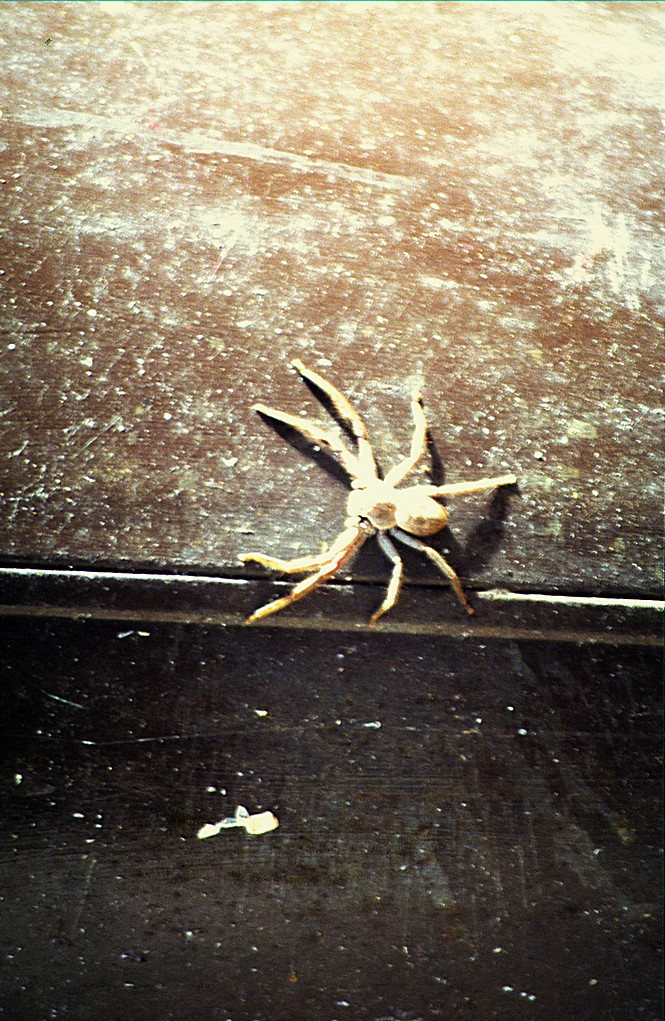 We were very low on bread and rolls, so we had one roll, two crusts of bread and opened a tin of tuna and with the cheese and biscuits and banana had a lovely lunch sitting on this little bit of beach and watched the birds, particularly an Avocet feeding in front of us. We'd noticed several bees on the sand which amazed us we think they were collecting water. We moved the van a short distance to a nice spot right by the beach and we'd just done that and I’d gone to put the rubbish in the bin behind us, when I noticed a huge spider the size of a crab, with legs about two inches long. We weren't too sure about him at all and we found out later from the Ranger that it was a Golden Orb spider.