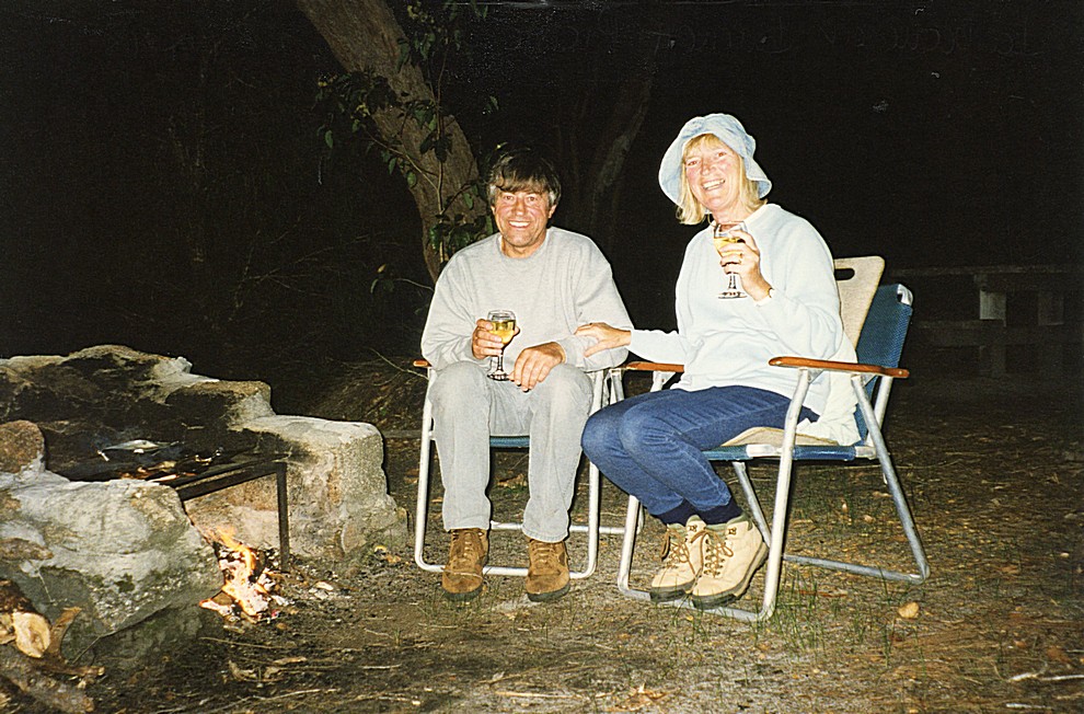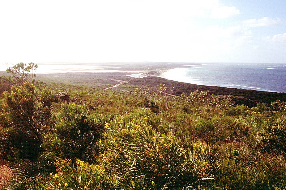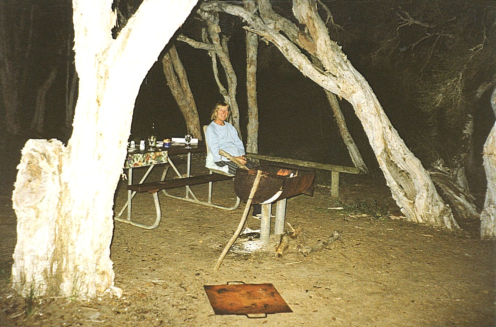 We enjoyed our early morning cup of tea outside and then got breakfast. Adrian rekindled the barbecue and we cooked bacon and egg on that and sat there watching the early morning birds and the sun rising in the sky. Adrian had a shock when he took the frying pan out of the boot of the van and a little mouse jumped out and ran away. We were reluctant to leave this idyllic spot, I couldn't think we could get anywhere lovelier. We left our spot about 8.20 and then called in to see the Ranger to collect some maps from him. His little boy the, older one Declan who was four, had just learned to ride a bike and was very proud of himself. We then called in at the entrance to sign the visitors book. It was now 8.45 and we returned to the main road and went along it for a few miles before turning off towards the sea again, down Fuss road. We then turned off onto a gravel road to Munglinup Beach, again a beautiful cove. The water became deep, quickly because there was an underwater reef a little way out which would have been ideal swimming, but there was very cool, strong wind blowing. There was a little campsite here but not as nice as the position that we'd been in last night as the site was back from the sea. We travelled a bit further west and then took a road down towards the coast again, a vast area here had been burnt. We reached the coast at a pretty little cove, Mason Bay, which shelved really steeply so the waves crashed against it. We had a paddle but you had to be careful that the paddle didn't become a submersion, and we had our tea and coffee there and the last of the fruit cake that we'd bought for Easter. We stopped at another beach a bit further on and having climbed over the sand dunes to get to the beach, it ended in a steep descent right into a lagoon made by the sea coming over a sand bank, and this was just perfect, as it was deep enough to swim in. So we had a lovely refreshing swim there, we hadn't come equipped for it at all, but anyway there were no people around anywhere.