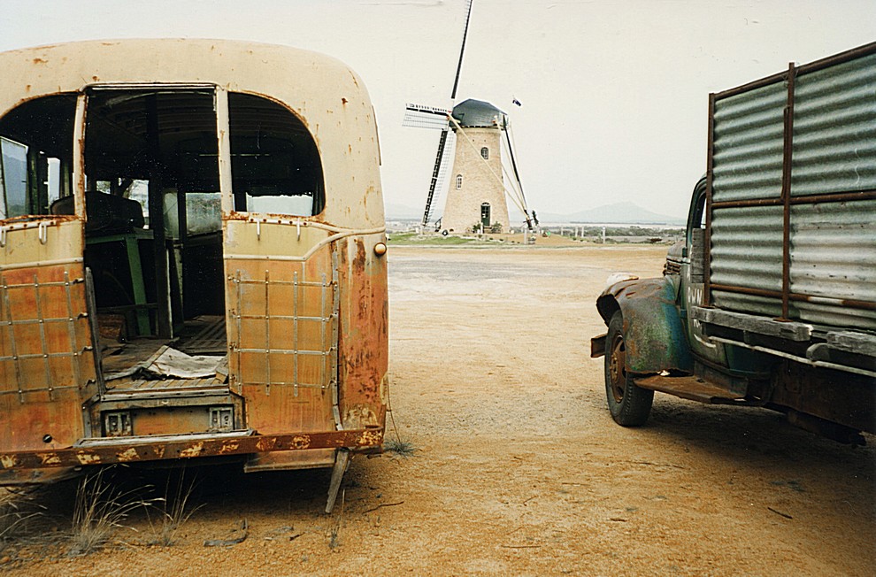 This was Anzac Day in Australia. We awoke to see the sun rising and shining down onto the water, the other side to which I'd watched the sunset on this little point. It rose into thin cloud shining down to the water which made it look rather like a black and white picture. We sat in bed for a long time with our cup of tea watching this beauty and various birds and ducks in the water. We put on the radio and realised how much Australia does make of Anzac day and heard some other sobering things, different accounts about both Gallipoli and about Thailand, where the Prime Minister of Australia was at then. We walked around this lovely quiet point, before leaving at 9.30 We had decided not to go down to Bremer Bay which was quite a long drive at least 40 kilometres each way and instead, we took the road to going inland to the Sterling Ranges. This was unmade up for a good percentage of the way and we stopped for coffee looking towards the Sterling Ranges which rise out of this flattish plain. We had only just had coffee when just along the road was a viewpoint shown by a camera and we wondered what it was and on looking found it was a windmill with a sign saying that it was the Vineyard. So we went in down the track and it appeared the ‘Lilly Windmill’ which had just been finished last year [in fact it was a windmill which had been built originally in 1906, but had been destroyed by fire in 1993. It had been decided to rebuild it using only second hand materials and had only just been finished], the vineyard looked very small. We were accosted by two small children outside the windmill and the little girl was selling tiny bunches of flowers and little rubber handmade bookmarks that she and her brother had made for 10 and 20 cents. I asked if she could tell me something about the windmill and whether it was an old one restored or a new one. She said "it's very old, it's taken six years to build", which to her was very old. We went inside at which point the boy fell over and was crying, so we didn't stop for anything else and if we hadn’t just have had coffee we would have had our coffee in there, being a little cafe as well. We bought a postcard and picked up a leaflet about it. Outside were two old vehicles - an old coach very much in need of restoring and an old lorry.