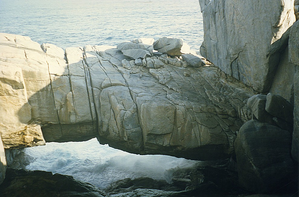 We had a little walk around by which time the photos were done, and we were very pleased, particularly as it was a film that had wound back a bit on film number three, but the pictures just went on as though nothing had happened, and we hadn't lost any at all, which was a delight to find. Having had a quick look through them, we then drove off round to Torndirrup National Park to the south of Albany and facing back towards Albany itself. It was now lunchtime, but we had difficulty finding a lunch stop. We drove right down to Frenchmans Bay, but there was a steep road down to a beautiful bay and we didn't want to take the camper down there. So we walked down and there was a little area with lots of people happily picnicking, it being a Bank holiday. We drove up from there and to the Old Whaling Station, but again, nowhere suitable for stopping, so we then took a road to the Salmon Holes, and had our lunch sitting looking out over the sea, on this dark, dramatic and very indented coastline. We were now on the southern side of this peninsula, south of Albany and we had a short walk to look down to the beautiful sandy bay beneath us, but felt we didn't need to walk to it as we'll be walking to others afterwards. In fact, the next one was the blowholes, which we walked to, and that was about 800 metres and rather precarious, I thought when we got there. Just on a steepish slope, the next thing being the sea beneath you, and it really was like a roaring dragon with spray coming up through a narrow slit in the rock. I certainly wouldn't have wanted to be there with young children - it did say lives have been lost and I wasn't surprised, but it was quite dramatic and a beautiful temperature for walking in. We had seen a dear little lizard on this walk and we then progressed to the two sights of the park, notably the bridge and the gap. This was a bridge of rock at the sea, absolutely enormous, quite mind boggling, and almost adjacent to it a huge deep vertical gap in the rock where the sea came in.