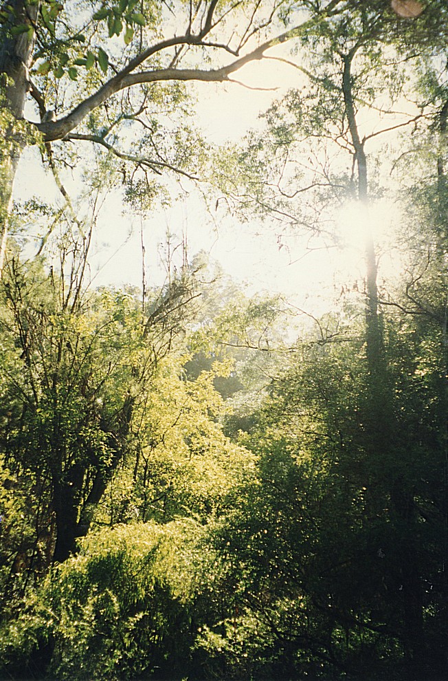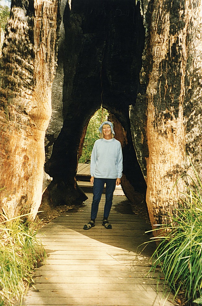 We awoke late and despite being on a main road, I hadn't heard any cars at all. One or two, literally, went by in the morning while we had our breakfast, sitting outside at the picnic table. It was a cloudy morning, and very still. We drove north on the Southwestern highway, through wonderful country of huge trees, we were in the area of these massive south-western forests and it was partly the Shannon National Park. Our first stop was there, where there was a car trail through the park, but initially we went on a shortish walking trail down to the river and back which was quite magnificent. It was absolutely still, just sounds of nature, occasionally you'd hear a car go by, shattering the peace because it was so still you could hear every sound. It had rained heavily here, though not on us and everywhere was damp, tall and green and every now and again water would sprinkle down from the trees. We came back to the van and had our coffee and biscuits sitting in warmish sunshine. A gentleman came up again and envied our Coaster. We progressed on this tree trail which was 20 to 23 kilometres, and how the interesting thing was, as when you were by a certain little symbol you stopped there and a recorded message was given to you on the radio telling you something of the surrounding area and the surrounding trees.