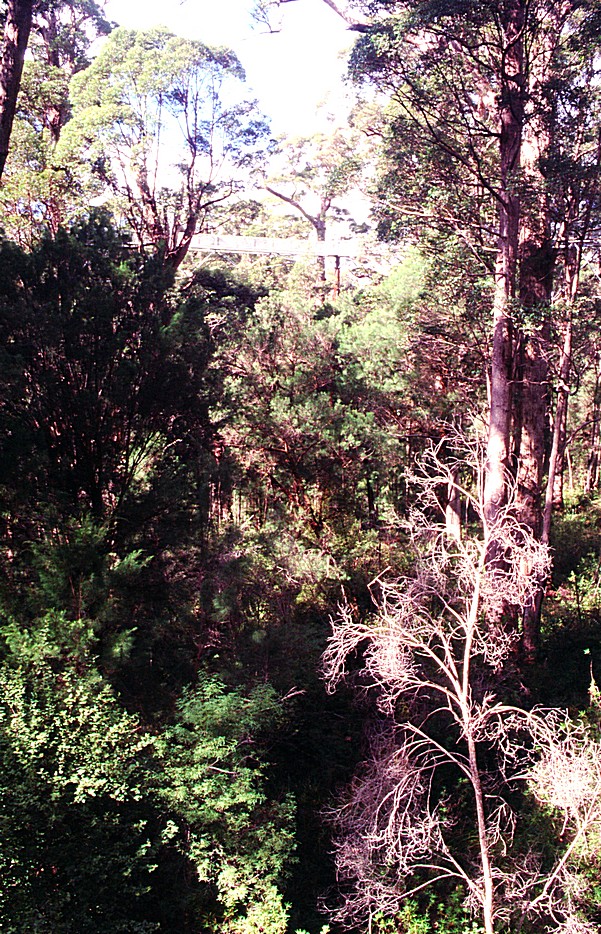 We were deep in the shade in our spot, but in fact it was a sunny day, with a cool wind. We had a walk along the beach in the opposite direction along flat rocks interspersed with white sand and came back through the land bit to the very large campsite, and as it says in the book a real credit to the local community. There were two loo blocks, one we found out too late had hot showers in it and all this for $4 a night, the total for the two of us and a very pleasant place and looking out onto a beautiful beach - it would be lovely and shady in hot weather. Just as we were leaving, when Adrian was emptying the rubbish, he met a chap of Dutch descent who was living here with his second wife travelling around, he seemed a very genial fellow. . We keep meeting people who had sold their houses and just travelling. We didn't leave until almost 10.30. We drove to the Walpole-Nornalup National Park and as luck would have it, just as we arrived a man was using a pneumatic drill by the carpark, so instead of having coffee in the van , I thought we would have some at the entrance - everywhere has coffee at their entrances - except this place. It was one time when I really could have done with a coffee. We headed for an area of tall giant tingle trees where they had made a walk 600 metres long up to 40 metres high around these trees. We had to pay $5 each for this and it perhaps would have been better if I hadn't paid the money and gone up there, because it wasn't very good for me. It was made out of slotted metal stuff so that you could see down below and although the barriers at the side were at waist level, I suddenly didn't like the experience at all. Between each little platform there were long spans, which did sway a bit, but not quite like Capilano, but it certainly didn't have a lot of enjoyment factor for me.