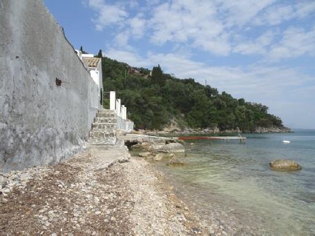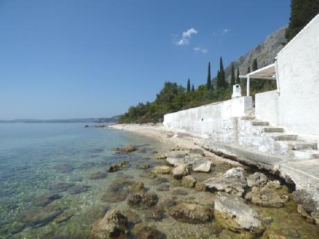 It was then a trip around the back streets to avoid going into Kerkira (Corfu Town) and stopping at Dimitra’s supermarket to stock up with provisions as we are staying in a self catering villa. This was about 20 km up on the NE coast near Nikassa. The driving here seemed at times no better than Sri Lanka. It was very green on the way as we passed through many small conurbations most of which were very touristy. It was therefore with some relief that we arrived at ‘Olive Press Cottage’ on an unspoilt bay. We drove down to our villa which is one of three places there – The owners house (Costas & Vicky), a larger house which is empty this week, and ours. Walking down the path in the hot sunshine (23°C) to our villa on a small pebbly beach by the blue calm sea, past the lemon and orange trees was so delightful. It was all very rustic and lovely.