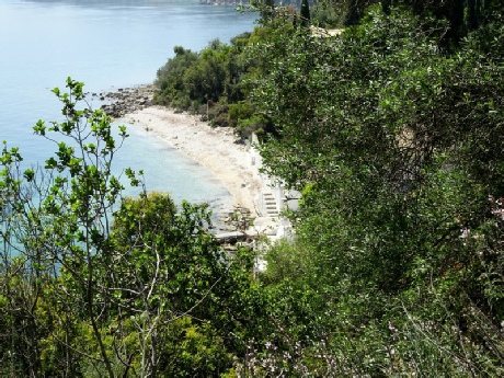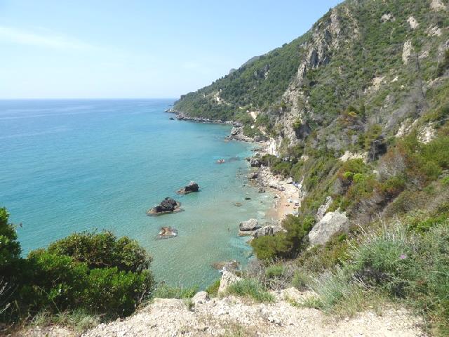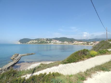 In mid afternoon, we set off in the car to see some of the coastline to the north. First stop was Kaminaki Beach, where we made a very long steep descent (from 120m), hairpinning down to a minute pebbly beach, where sunbeds were stacked ready for summer. The sea was an aquamarine blue, but we didn’t think that it would be much fun dodging all the vehicles on the narrow lane to find a cramped spot by the sea.
