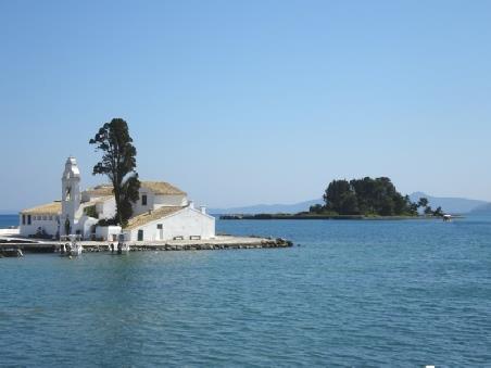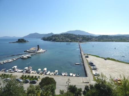 We now drove to the southern end of Kanoni peninsula, where the airport is situated. You would have no idea of this from the much photographed southern tip, where we stopped to view the two pretty little islands of Moni Vlahernas, reached by a causeway, and Mouse Island, both with little churches on them. We viewed from below and above, where there was a flourishing cafe with fantastic views.