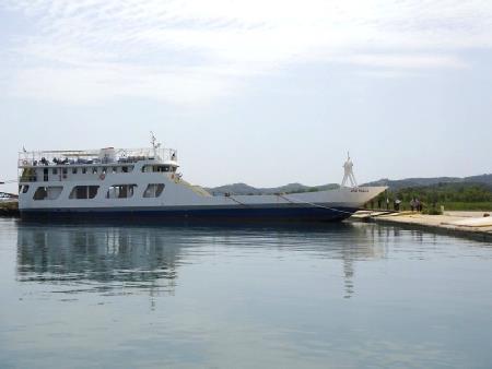 The ferry at Lefkimmi Port, about to leave for Igoumenitsa on mainland Greece (in the distance)