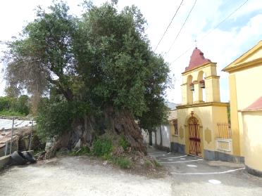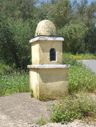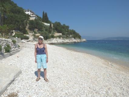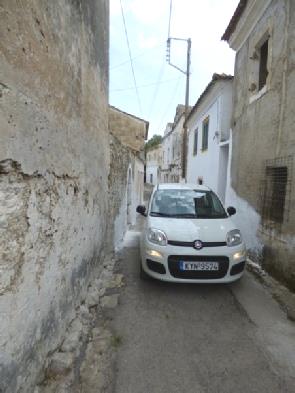 First we were looking at the bit of coast before it. We had to drive back to the main road, then through the incredibly old and crumbling village of Argirades with its narrow, twisted roads. A massive olive tree was growing opposite a church. After taking a picture of this, we stopped to photograph the narrow lane when a lady called Layla(?) signified to Adrian that she would direct him (although we weren’t lost). She spoke no English at all, so did everything by mime and signs. She led him up the road, saying that she knew that we were heading for Agios Georgios, on the coast. She gesticulated for Adrian to reverse the car down the next bit of road – this was so that he could negotiate the tight hairpin bend.