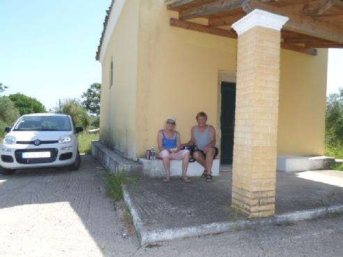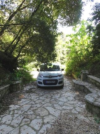 After a pointless wait for 10 mins on the stairs down to the tarmac to board the plane (why does Easyjet do that?), we had a pleasant 3 hour flight to Corfu in the hazy sunshine, passing over Germany and the snowy Alps and down the Croatian coast landing at 11.00 local time (2 hours on). Quickly through passport control and baggage collection we were out into the sunshine to look for the shuttle to collect our car. It went a bit wrong here, where in Greek style, the instructions were very unclear as to where the pick up was, so after wandering around for some time, a phone call was needed! Then it was up to Goldcar where we quickly got through the paperwork and were off in our ‘brand new’ Fiat Panda.