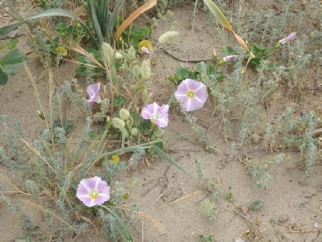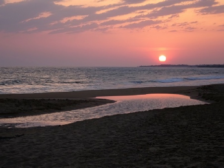 A bit later we walked down onto the wide sandy beach. It was a bit windy, with more waves than yesterday. The orange coloured hill up behind made us think of Golden Cap in Dorset. We walked along for quite a way, coming back to sit on the sand before wading back across the stream which comes out to the sea here. The temperate has been 30°+ today.