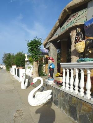 There were four tables of people at breakfast this morning, including the Dutch couple who were leaving. They were annoyed yesterday that there were no ferries to Igoumenitsa today, being a bank holiday. Anna had decorated the little man statue outside the taverna with roses for May Day. The two little German children seemed fractious with colds.