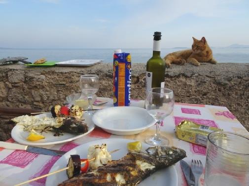 Tonight we barbecued the sea bass we had bought – hampered again by the numerous cats!