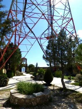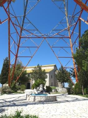 The monastery dwarfed by the communications tower