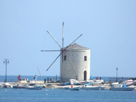 We now drove south of Corfu Town to look back to it and the old fort across the bay. There was an atmospheric old windmill and a restaurant where lots of people were enjoying Sunday afternoon. Others were sunning themselves at the end of Mon Repos beach. Little boats were anchored in the bay. We both enjoyed an icecream -mango and honey & nuts –soaking up the atmosphere and the view. They were even playing a favourite REM song of ours ‘Everybody hurts’.