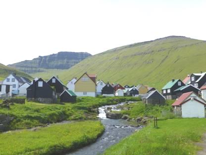 We drove back up the coast to Velbastadur, a workaday village above the sea, where even the school was turf roofed, but it was too foggy to go further. We resorted to Adrian’s satnav to find the road back to Torshavn.