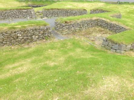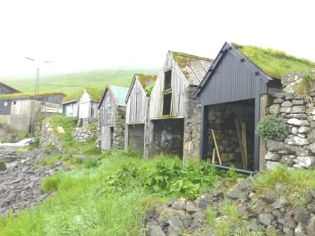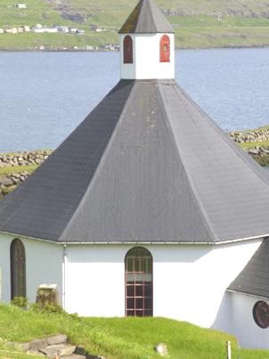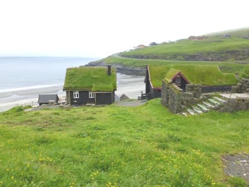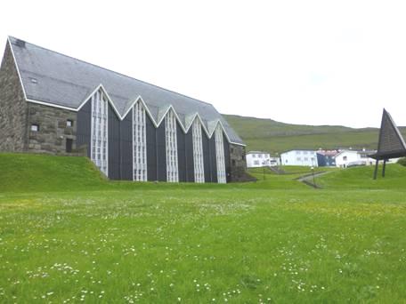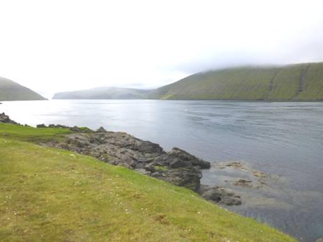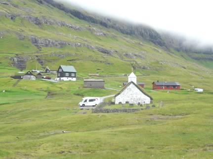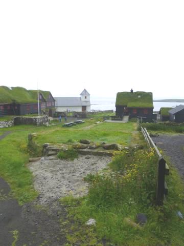 The weather was even foggier on our return journey on the high mountain road. We turned off to drive down to Kvivik, an attractive village with pretty houses mostly painted white at the base, with rust coloured or black upper parts. The little church here is renowned as the place where the priest in 1855 gave his sermon in Faroese, not Danish, which shocked everybody. It was about a hundred years later that Faroese was accepted as the official language. The foggy weather didn’t entice us to explore, but there were more Viking ruins here.