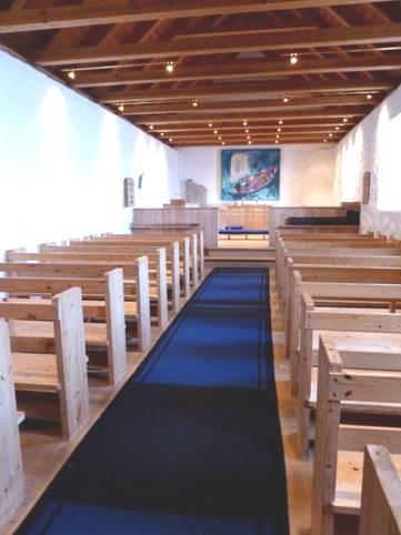 We located the Post Office, and sent off our card to them. This was opposite the church, Christiankirkjan – the only ‘sight’ in Klaksvik. It was a modern church, built n 1963, and yesterday had been a special service to celebrate 50 years. It was extremely high, with long windows in the simple wooden building. There was a very ancient font, and an attractive fresco behind the altar which used to be in the church in Torshavn. The verger was very pleasant, and chatted to us. Hanging high (too high to see properly) was a sailing vessel which had been used by the minister in the past to visit the outer isles, and had also survived a ferocious storm when two other boats with it had perished in 1913.