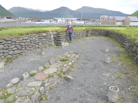 Now 2.30, we drove back through the 6.3km under-sea tunnel – Adrian had bought a ticket at the petrol station - and arrived at Leirvik, on Esturoy Island. There were some Viking remains here. We had some trouble in locating them, and more trouble in getting there. There was no parking, and the nearby road was closed. We tried a car park by the church, but a funeral was taking place (presumably somebody important, as the flag was at half mast), and the car park was full. The bell tolled solemnly.