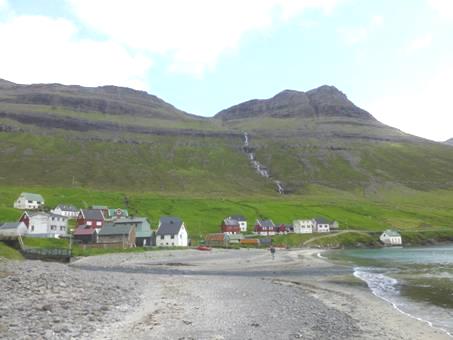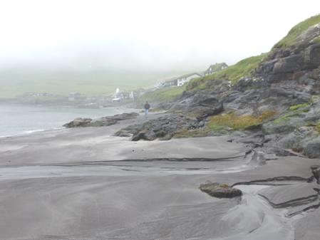 We were now near the tunnel entrance, but took a road going south, and soon came to a delightful little village called Leynar. This was less foggy. Black turf-roofed houses stood just behind the sandy beach. We walked down and right along the beach, as whimbrels called and other birds circled overhead.