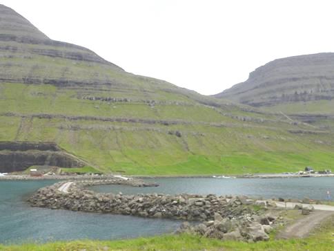 We drove on past Torshavn to take the road to Kirkjubour, in the far south of Streymoy, turning off first to zigzag down to Gamlaraett. There is nothing here at all except a harbour for the ferry to the islands of Sandoy and Hestor. The good thing was, the weather was clear. A ferry arrived while we were there, and a lot of vehicles came for it.