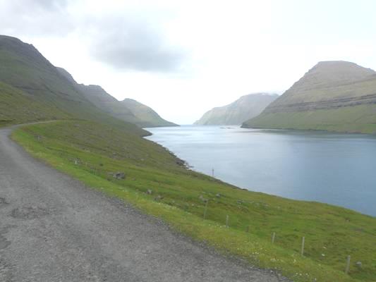 We crossed on the causeway, back to Bordoy Island, intending to drive up the road on this shore to the supposedly abandoned farm of Muli. We started off on the narrow, badly surfaced road, high above the fjord – this time there was no crash barrier!