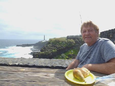 We left at 11.15, driving south towards Tazacorte, where there was virtually no water in the river Angustias – no wonder everybody was looking the other day. At Argual there was a busy street market. We drove through Los Llanos, taking the steep road again to El Paso. We had planned to eat out today, and had chosen a restaurant in El Paso. We decided not to stop now, as the weather was clear, so we made for la Cumbrecita. We drove up the road into the forest, coming to a kiosk where the dour man asked for our tickets. We hadn't known about tickets, but it appears that only 20 cars are allowed at a time, until 4.00, when it is open for all to drive. We couldn't work out the logic of it, but returned to the visitors centre to find out. Nothing really worked for today, so we agreed to try to book a 'place' for Tuesday, on our way to the airport. When we returned to our house in the afternoon, Adrian immediately tried to book on the internet. After filling in all kinds of information, such as passport number, he then had to put nationality. All names of countries were in Spanish. There were all sorts of obtuse countries, but we couldn't find anything we recognised as being England or Great Britain (it’s actually Reino Unido but we had forgotten. You would think it would be put in in the language of the country of the person looking for it!). We then found that you had to print 2 tickets – how? most tourists don't have access to a printer. We gave up at this point – some things just don't work out!