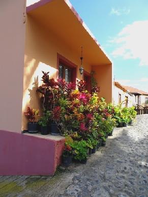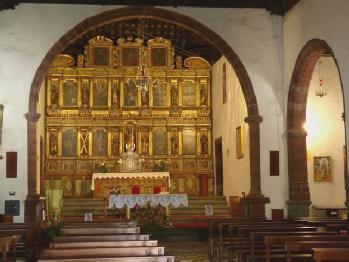 We now took the zigzags back over the Barranco Angustias, stopping at the town of Tijarafe, where we found our way to the delightful old centre – quite bereft of people again. We walked up cobbled streets, each stone edged with moss. Pastel coloured Canarian houses with tiled roofs lined the street. There was an ancient wine press beneath the small square with its large white Virgen de Candelaria church and its wooden balcony. This time the door was open, so we were able to peep in to see a very different baroque altarpiece.