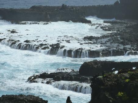 We climbed back up and continued on the road up the western side. We were coming into banana country. There were plantations everywhere, many of them netted, which wasn't attractive. Further up the coast we came to Punta Larga, a pretty black lava cove, where huge ultramarine waves crashed onto the rocks and the shore. There were a couple of simple fishing boats and several shack type dwellings. A small restaurant stood at the back of the cove. The nearby toilets were remarkably clean and well kept. We'd brought some lunch things with us, but decided to try out the restaurant. The tables were made of beer barrels, and the seating was upright logs topped by splodgy cushioning, looking like mushrooms. Adrian's calamari was excellent, my fish croquettes 'interesting' and the chips very good. Adrian had asked for a large beer with two glasses, but we were brought two large beers! There was a big bowl of bananas, with a sign saying ‘free to customers’. It became a bit windy as we sat there, and we were annoyed at people smoking. Tourists on la Palma seem to be predominantly German.