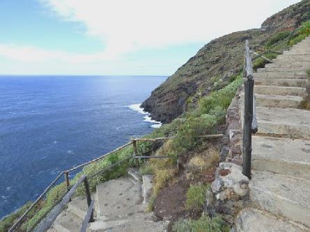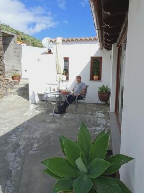We now took a minor road, which ended up in banana groves. It was really quiet when we ate our lunch, sitting on rough stones. We rejoined the main road at El Jesus before crossing dramatic Barranco El Jorado, where we were again in mizzle, or perhaps cloud. Mirador El Garone would have been amazing if we could have seen anything, as it went vertically down for a very long way. We now reached Puntagorda, where we are going to be staying, and located the house. We were too early, as it was 2.30, and we had agreed to arrive between 4.00 and 5.00. We decided to drive to the coast, and zig-zagged down steeply for 4.4 miles, where the road ran out. From here it was still hundreds of feet vertically down to the sea. There were steps going down, with a broken fence - not for me! Down another steep slope there was a shack built into the rocks, presumably where somebody lived. We wondered why anybody would bother to build a road down to this spot, but it turned out that before the main road was built to Puntagorda in the 1950's, this 'port' was the only connection with the outside world and people must have walked down the 4 miles and 700m to reach it!