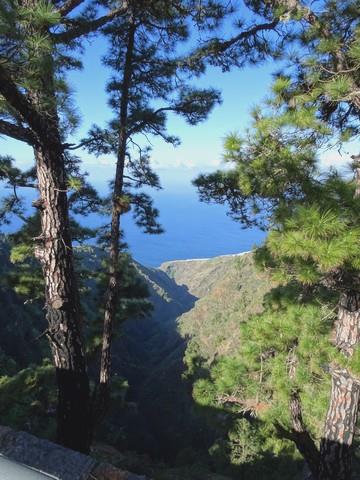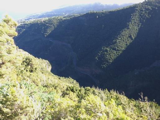 We rejoined the main road to Roque Faro, where we couldn't find anything to see, then tuned off again onto another white road, which wiggled constantly. We were driving through steep pine forests very high up. We stopped at Mirador de las Mimbreras. It was an amazing road, very narrow, through the vertical forested slopes.