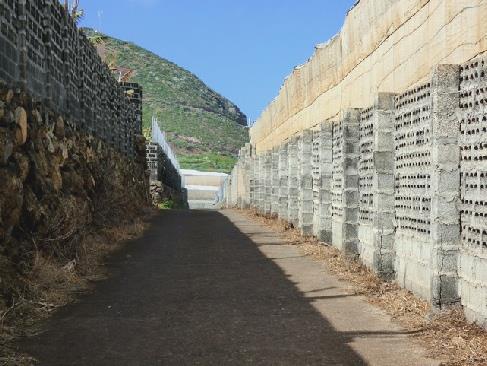 A typical road through the banana groves, with high walls and netting