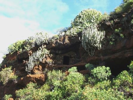 At Cueva de Agua it was more sheltered. There were flowers, cacti and succulents as we looked across to the caves set into the rock face. There were no trees here, just a thick covering of low shrubs. As always, there was a deep valley down towards the sea.